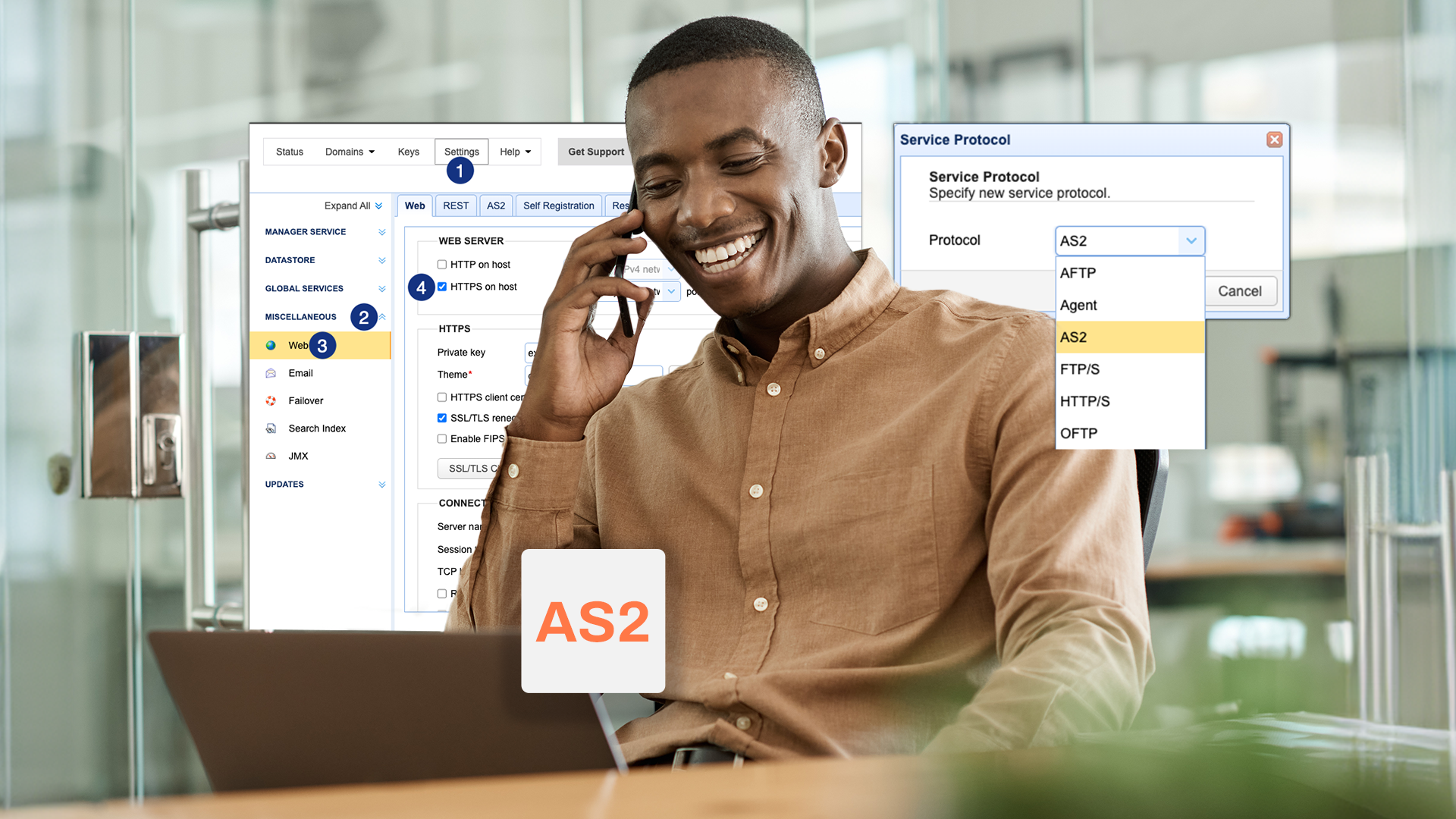Before you can start setting up AS2, you have to enable HTTPS first. To do that, click the Settings menu, expand the MISCELLANEOUS menu and then select the Web module. After that, tick the “HTTPS on host” checkbox to enable HTTPS. Click the Apply button to apply the changes.